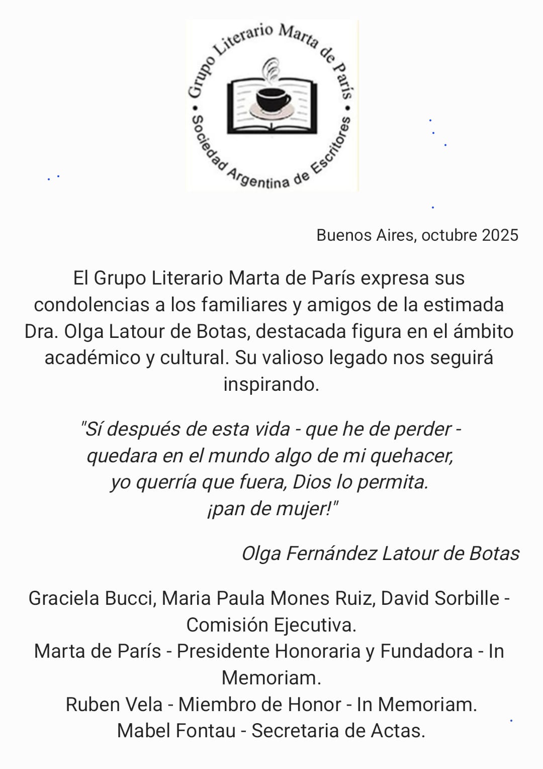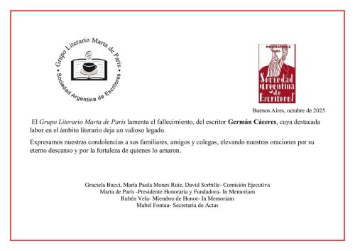 Condolencias por el fallecimiento de Fernanda Vela- Grupo Literario Marta de París