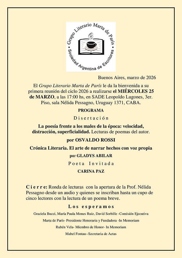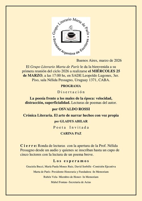 PRIMERA REUNIÓN 2026 DEL GRUPO LITERARIO MARTA DE PARIS- 25 DE MARZO- SADE 17.00HS- SALA NELIDA PESSAGNO- 3ER. PISO. – Marzo 2026